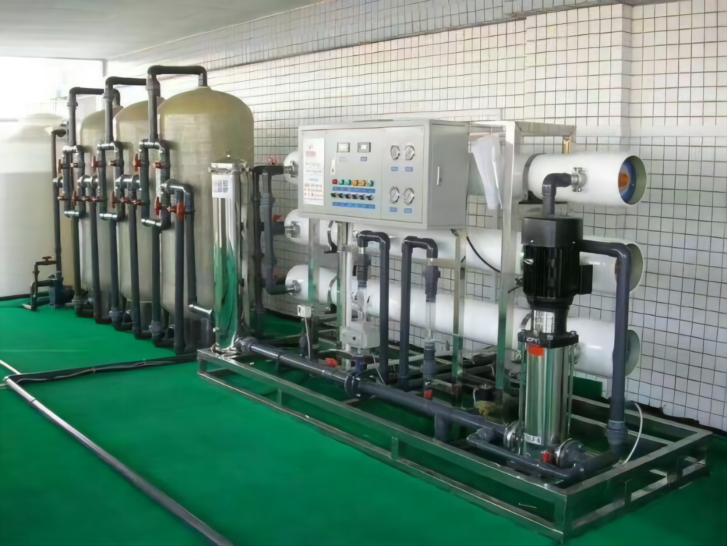 ①原水→原水泵→多介質(zhì)過濾器→活性炭過濾器→軟化過濾器→保安過濾器→高壓泵→RO反滲透→純水箱→出水口(電導(dǎo)率≤10μs/cm);