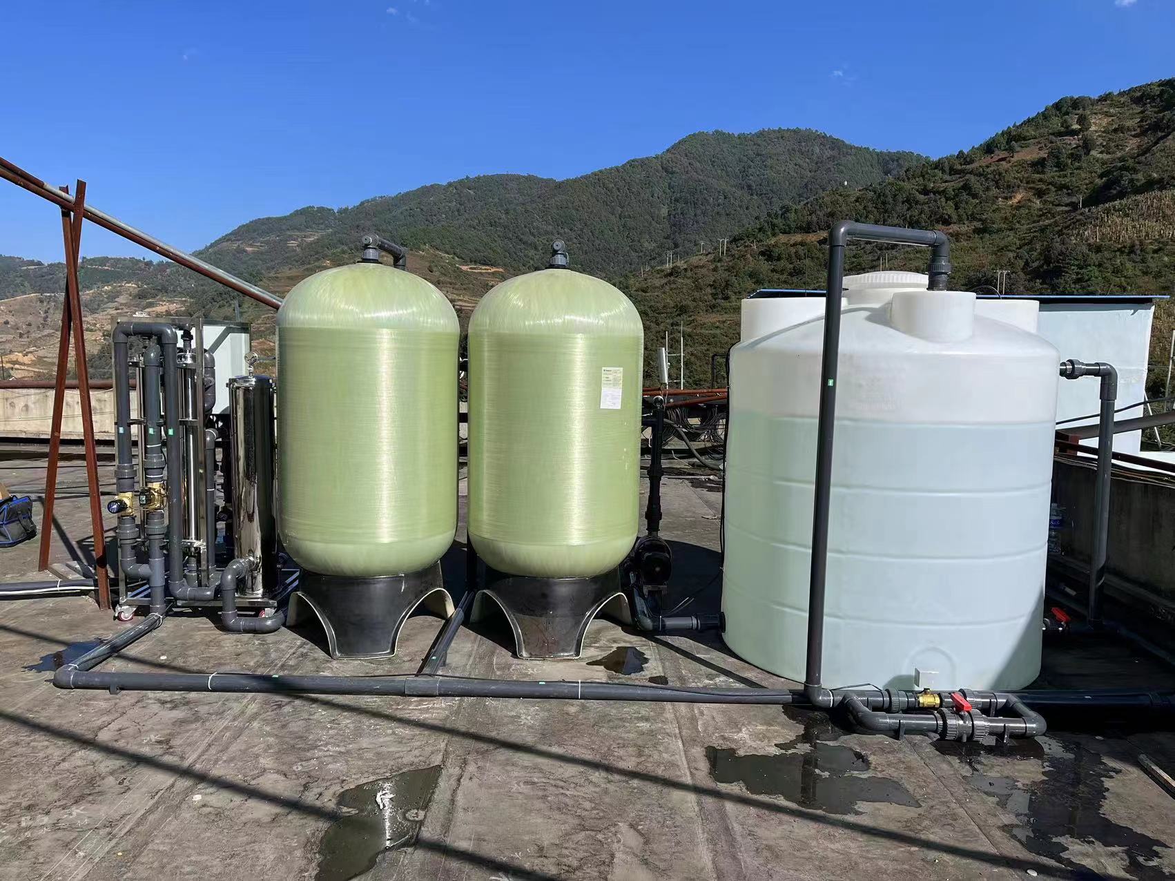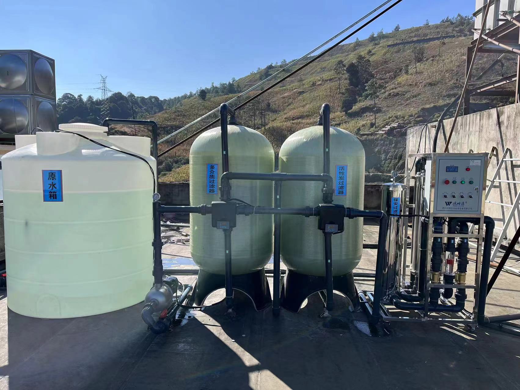 工藝流程:進水→原水箱→原水輸送泵→多介質過濾器→活性炭過濾器→精密過濾器→超濾過濾裝置(產水量≧10T/H)→超濾水箱→出水口。
